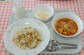 鶏ごぼうピラフ ミネストローネ フルーツヨーグルト