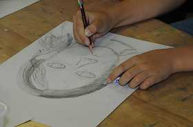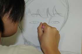「色の濃淡で」をテーマに、友だちの顔をデッサンし、一色で表現します。