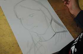 「色の濃淡で」をテーマに、友だちの顔をデッサンし、一色で表現します。