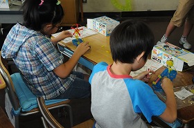 電池のつなぎ方とモーターの強さの関係を確かめています。