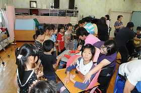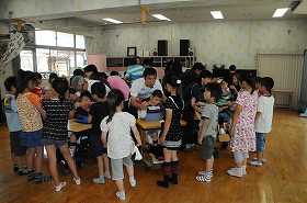 6/26 2−1とわかたけ学級の交流・頭で握手