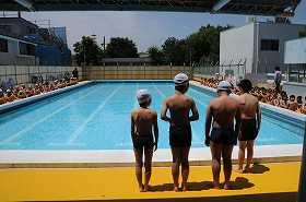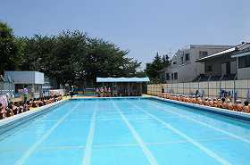 晴天の下で、5・6年生が今年度のプール開きを行っています。
