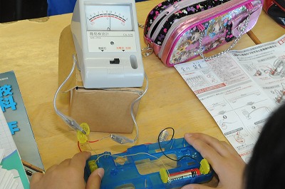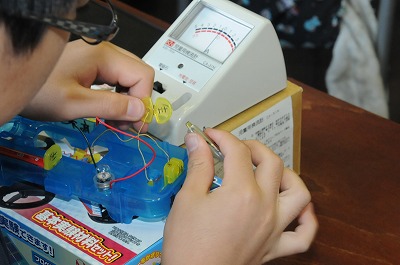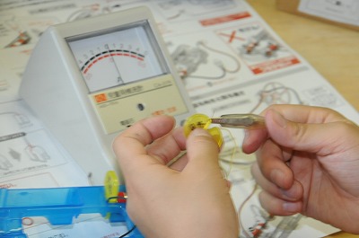 検流計で電流の強さを測っています。