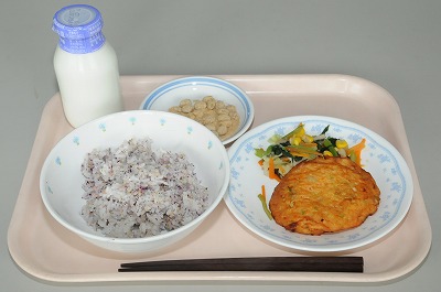 ゆかりごはん 手作り薩摩揚げ 青菜とエリンギのソテー 黒糖大豆