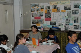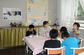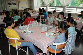 今日は5年1組の子どもたちがランチルームで給食を食べています。