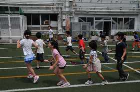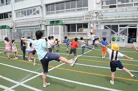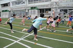 健康トレーナーによる、「レッツじょいふる」です。今日は校庭で、健康体操をしています。