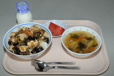 麻婆ナス丼 わかめスープ トマト