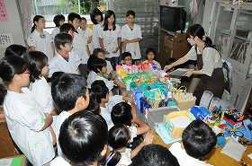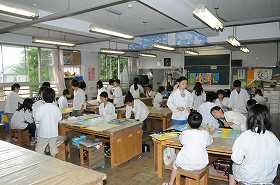 「音が鳴る絵」をテーマに、作品を仕上げています。まず、絵の具の扱い方を確認しています。