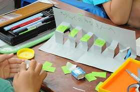 自分たちで作った飛び出すカードにお礼のお手紙を書いています。どこに出すのでしょうか。