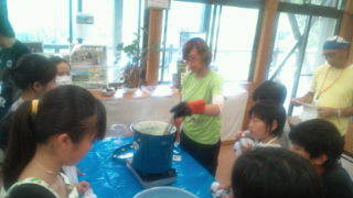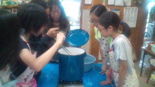大山千枚田の棚田倶楽部にいます。午後は藍染めとわら細工です。このグループは藍染めです。作業が進んでいます。13:10