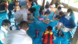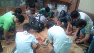 大山千枚田の棚田倶楽部にいます。午後は藍染めとわら細工です。このグループはわら細工です。作る目標はカメです。13:00