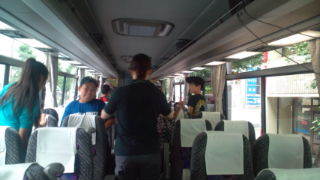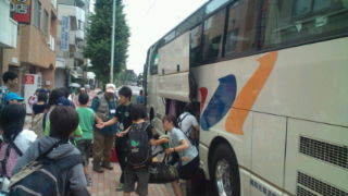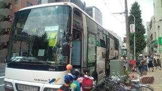 6年生が今日から3泊4日で興津自然宿泊体験教室に出かけます。目黒通りからバスに乗り出発しました。8:10