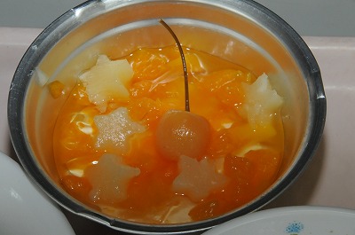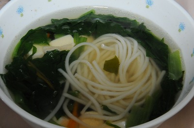 今日は一足早い七夕メニューです。7月7日は天の川を渡って、織り姫と彦星が合える特別な日です。給食では、そうめんを天の川に見立てたスープと星型のパインとナタデココを入れたゼリーを作りました。