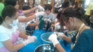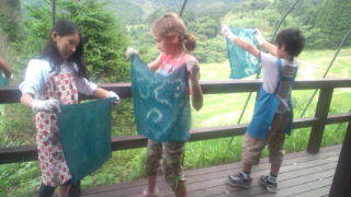 大山千枚田の棚田倶楽部にいます。午後は藍染とわら細工です。このグループは藍染です。作業が進んでいます。13:50