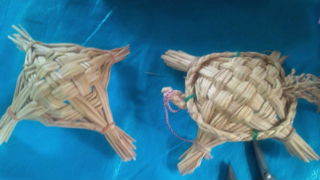 大山千枚田の棚田倶楽部にいます。午後は藍染めとわら細工です。このグループはわら細工です。作る目標はカメです。13:00