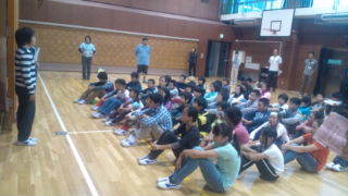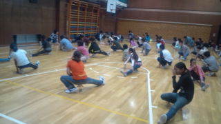興津の学園にいます。体育館で朝会が行われています。行動が早く10分前に始まりました。雨が降っていないので予定通り活動します。6:20