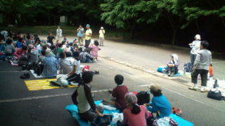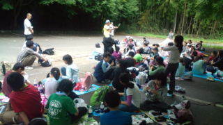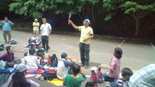 お昼ご飯が終わり、鹿やヒルなど山の生き物の話を聞いています。12:00