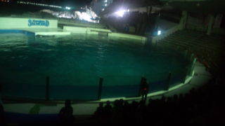 鴨川シーワールドにいます。ナイトアドベンチャーです。飼育係の説明を聞いています。20:20