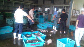 大原漁港にいます。せりの様子を見学させていただいています。10:05
