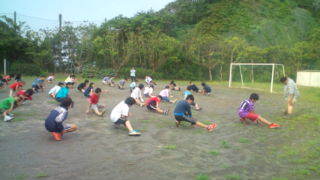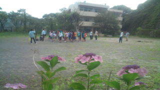 おはようございます。興津の3日目を迎えました。子どもたちは元気に起床し、校庭で朝会を行っています。校庭6:30