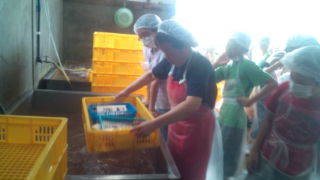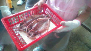 大原漁港にいます。後半は2組は漁港の話を聞き、1組は魚の開きを作る体験をします。11:00