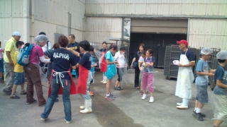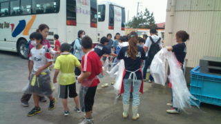 大原漁港に着きました。最初1組は漁港の話を聞き、2組は魚の開きを作る体験をします。9:00