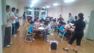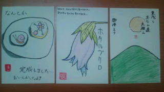 学園にいます。夜の学習が終わりました。子どもたちががんばって描いた絵手紙の作品の一部です。20:30