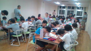 学園にいます。俳句作りが終わった子どもたちは絵手紙を描いていますし。19:50