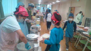 興津の学園にいます。朝食の準備が行われています。みんなが協力して行動しています。6:45