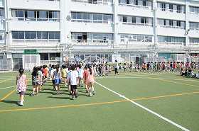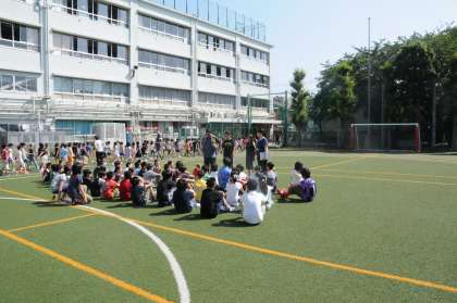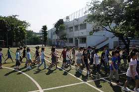 子どもたちは音楽に合わせて教室に向かいます。6年生は今日から体験で登校する2人を紹介しています。