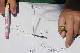 太陽と影の関係を屋上で観察しています。