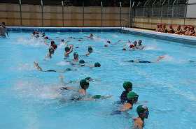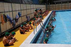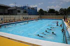 真夏のような太陽の下で、子どもたちは水慣れの運動をしています。