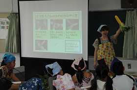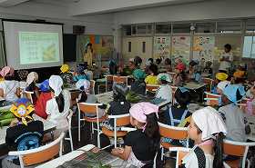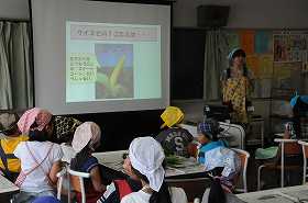 トウモロコシクイズの後、皮むきのやり方を聞いています。