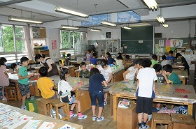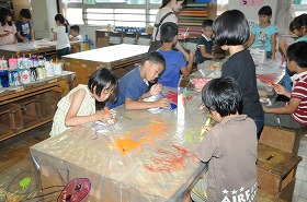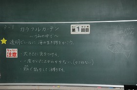 「カラフルカーテン<海の中で>」をテーマに透明ビニールに海の生き物を描いています。