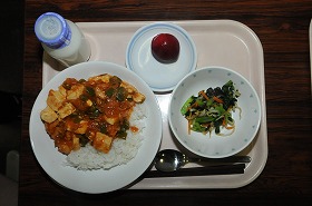 今日の主菜は、ピリッと辛い豆腐とエビのチリソースです。唐辛子の辛さが食欲をアップさせてくれます。果物は今が旬のプラムです。山梨県の完熟プラムはとても甘くてジューシーです。皮ごと食べましょう。