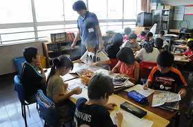 食材の産地をチラシなどを見ながら調べています。