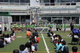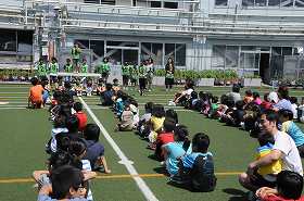 今日のなの花タイムの縦割り班は、班ごとに協力して行うゲームです。まずゲームについての説明を聞いています。