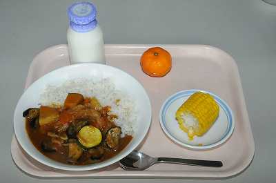 今日は、夏野菜のカレーライスです。全部で4つの夏野菜を入れました。さらに西東京市の田倉農園さんから届いた旬のトウモロコシは2年生が一生懸命皮むきをしました。夏野菜を味わってください。※今日の夏野菜は、かぼちゃ、トマト、ズッキーニ、なす、トウモロコシです。