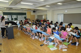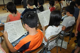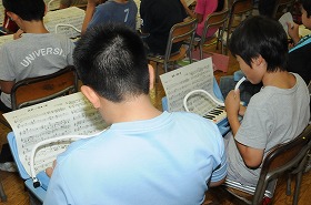 配られた楽譜を鍵盤ハーモニカで練習しています。