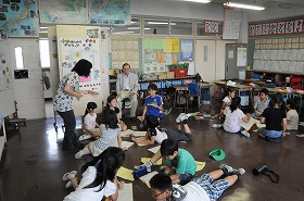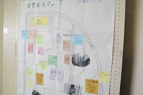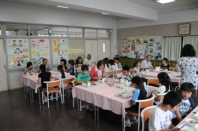 午前中のフィールドワークを終え、お世話になっている地域の皆さんとランチルームで給食を食べています。午後からは、発表に向けてのまとめです。