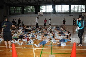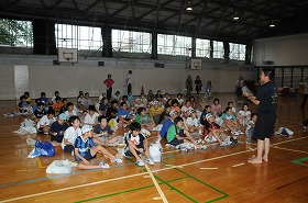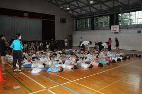 今日は命を守る着衣泳を5年生と6年生が行います。5年生のあとに6年生が体育館で命を守る着衣泳についての話を聞いています。