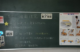 「油面住宅」をテーマに、のこぎりの使い方に気をつけながら家の組み立てをしています。