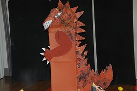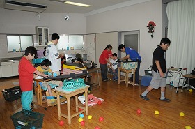 ゴムの力を使って手作り紙ボールを飛ばし、的に当てるゲームをしています。