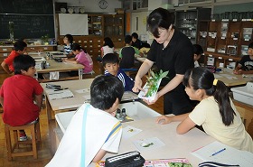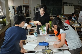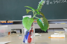 植物の水分や養分の通り道を調べるために、色の付いた水を吸い上げた植物を観察しています。