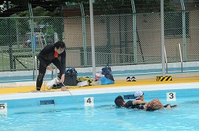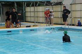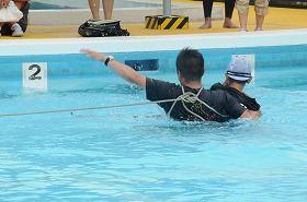 命を守る着衣泳のまとめとして、子どもたちの代表が役割分担をして、水の中にいる時、どのように命を守るかを指導員とともに劇で演じています。