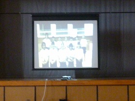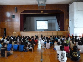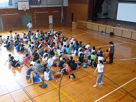 校内見学を終えた子どもたちが体育館に戻り、四中の説明DVDを見ています。