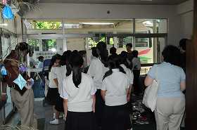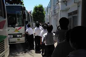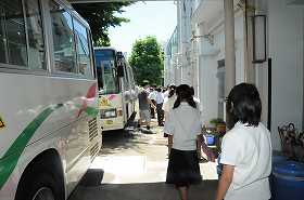 わかたけ学級の子どもたちが通学で使っているバスを順番に見学しています。