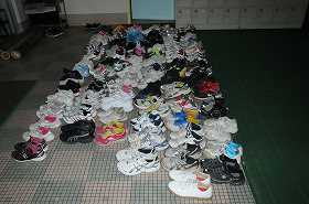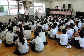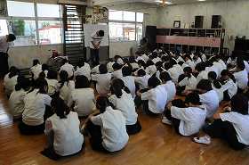四中の1年生がわかたけ学級訪問のために来校しました。まず集会室に集まり、説明を聞いています。玄関にきちんと並べられている靴は、さすがに大きいです。