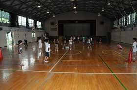 お楽しみ会でドッジビーのゲームをしています。