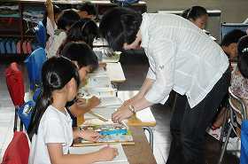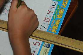 決められた長さを定規ではかり、正確に線に書いています。